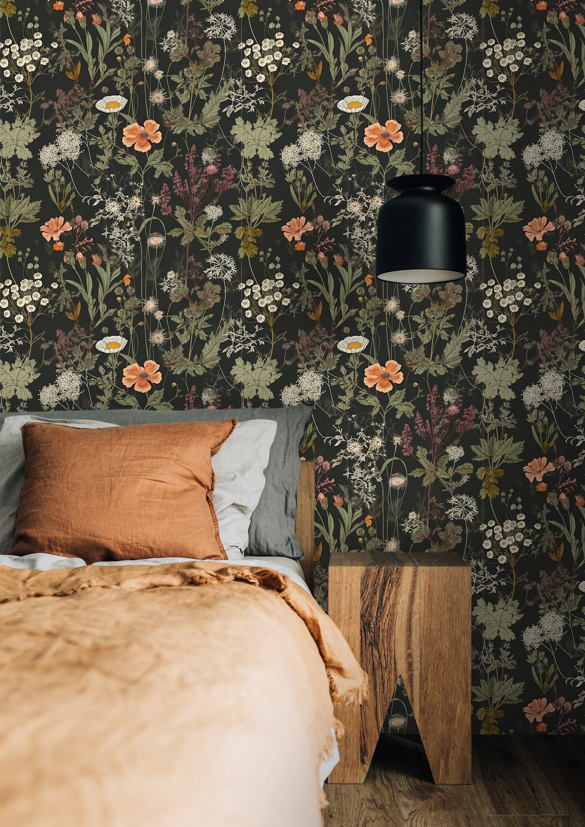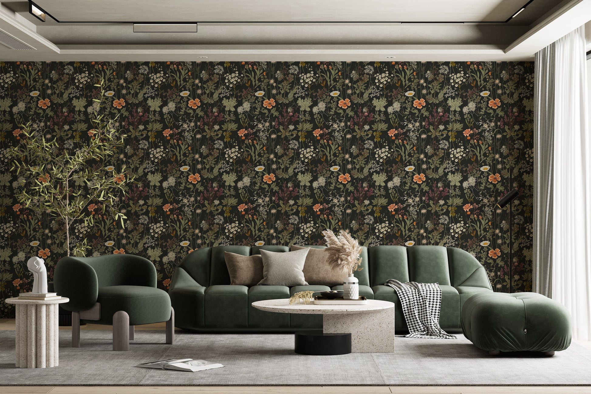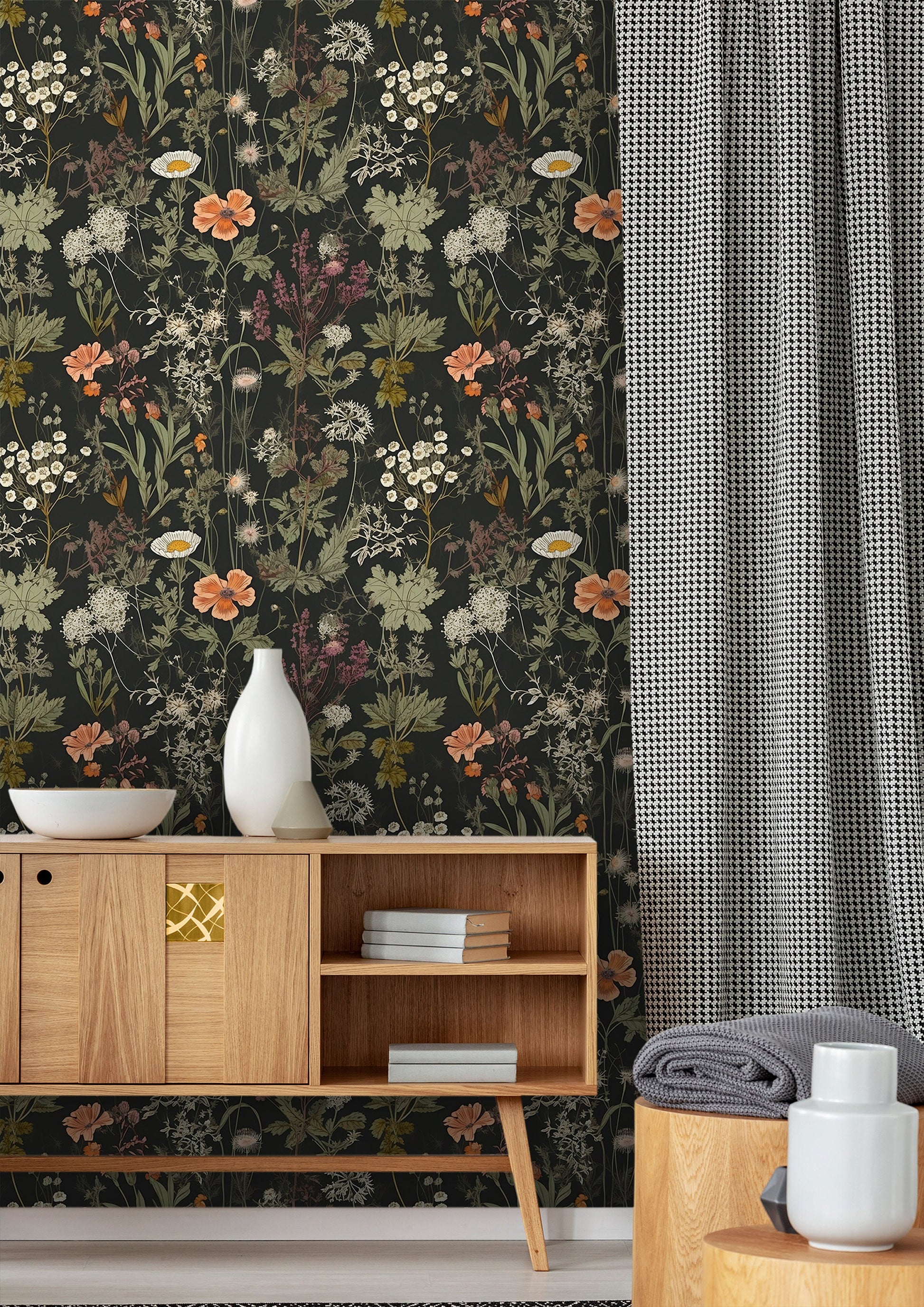 Dark Wildflower Botanic Wallpaper | Dark Floral Pattern Wallpaper | Dark Botanic Removable Wallpaper | Dark Flower Peel and Stick Wallpaper