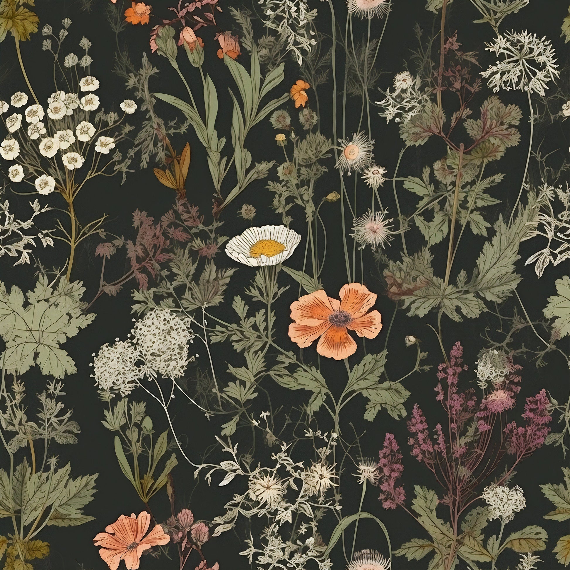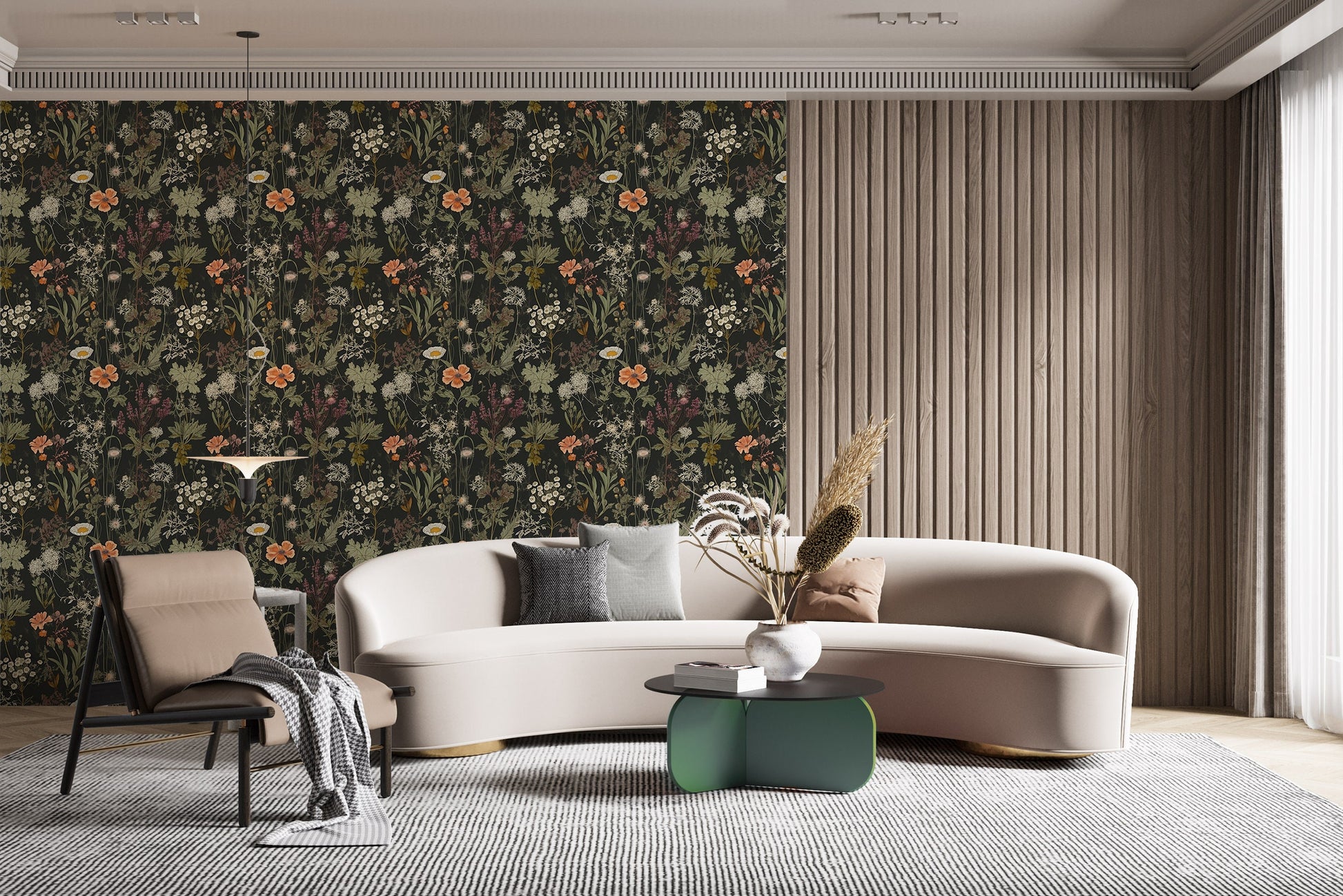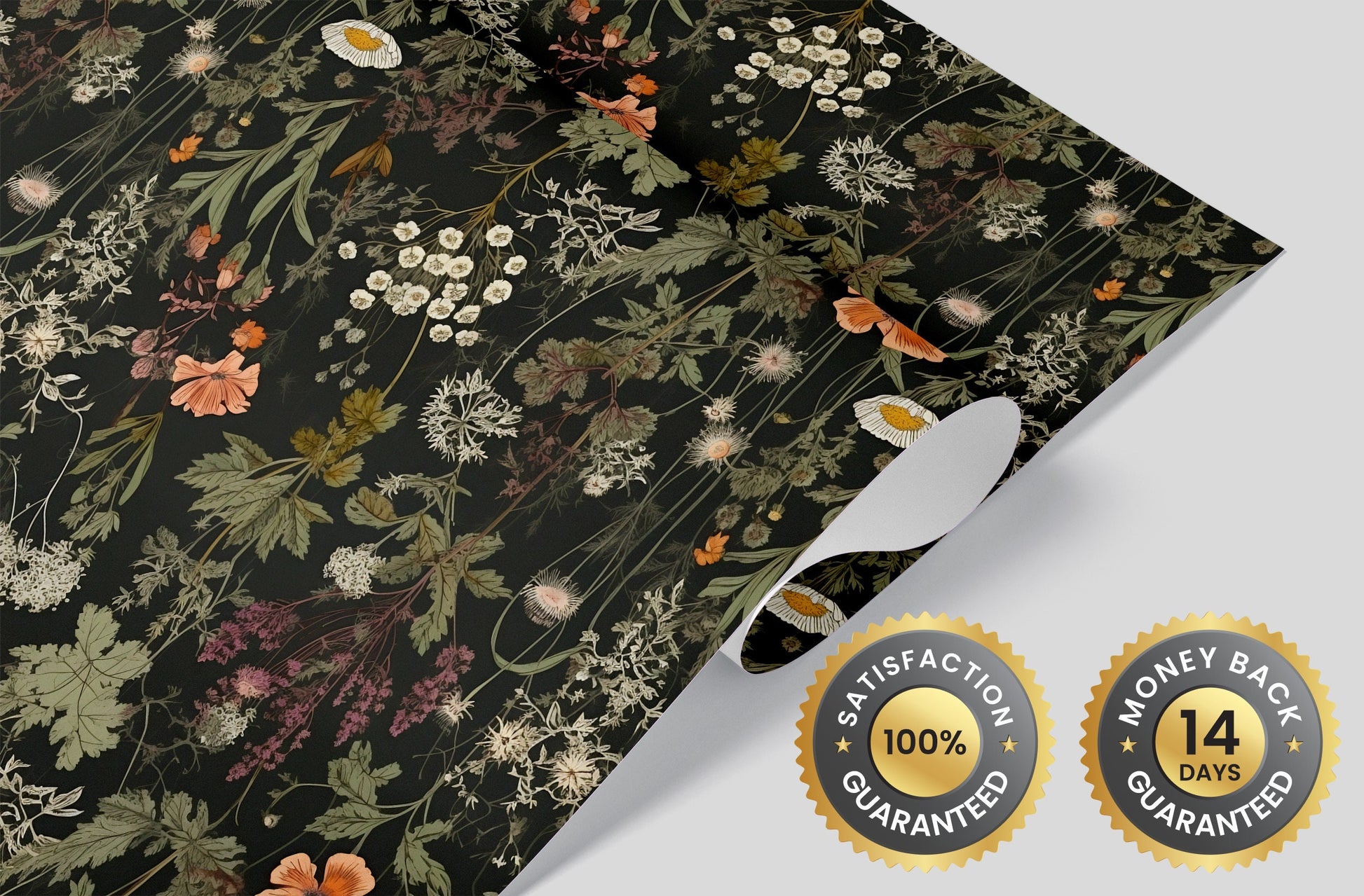 Dark Wildflower Botanic Wallpaper | Dark Floral Pattern Wallpaper | Dark Botanic Removable Wallpaper | Dark Flower Peel and Stick Wallpaper